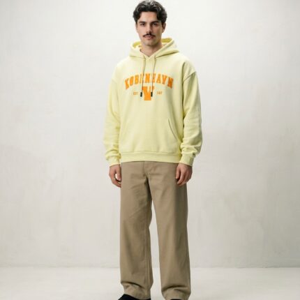 Oversize hættetrøje i kraftig kvalitet af 100% bomuld med motiv i filt med broderede kanter foran. Hætte med løbesnor i ekstra kraftig kvalitet og med solid metal afslutning. Lomme foran og ribkanter nederst og på ærmerne. Detaljeret patch med tekst og københavner-motiv syet på lænden venstre side bagpå.