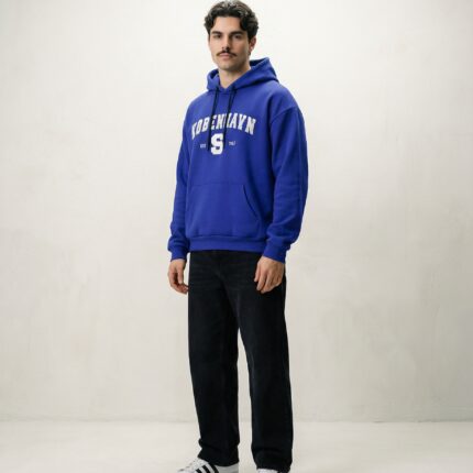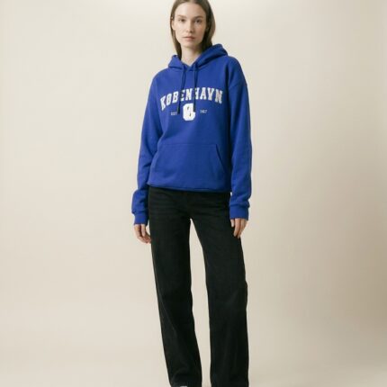 Farven på denne hoodie er inspireret af de gamle blå emalje-vejskilte du kender fra vores gader og stræder. Man har anvendt emalje siden oldtiden, men teknikken blev særligt populær omkring renæssancen og derefter, også her i Danmark. Et eksempel herpå, er Christian IV’s krone, hvorpå teknikken blev anvendt i kombination med ædle metaller og sten. Den blå farve var dog den eneste man havde tilgængelig til emaljeproduktion udover sort og hvid, som man normalt brugte til skilte, så det var mere af praktiske årsager end et bevidst stilvalg, at det blev den blå farve vi nu ser på vores smukke vejskilte.