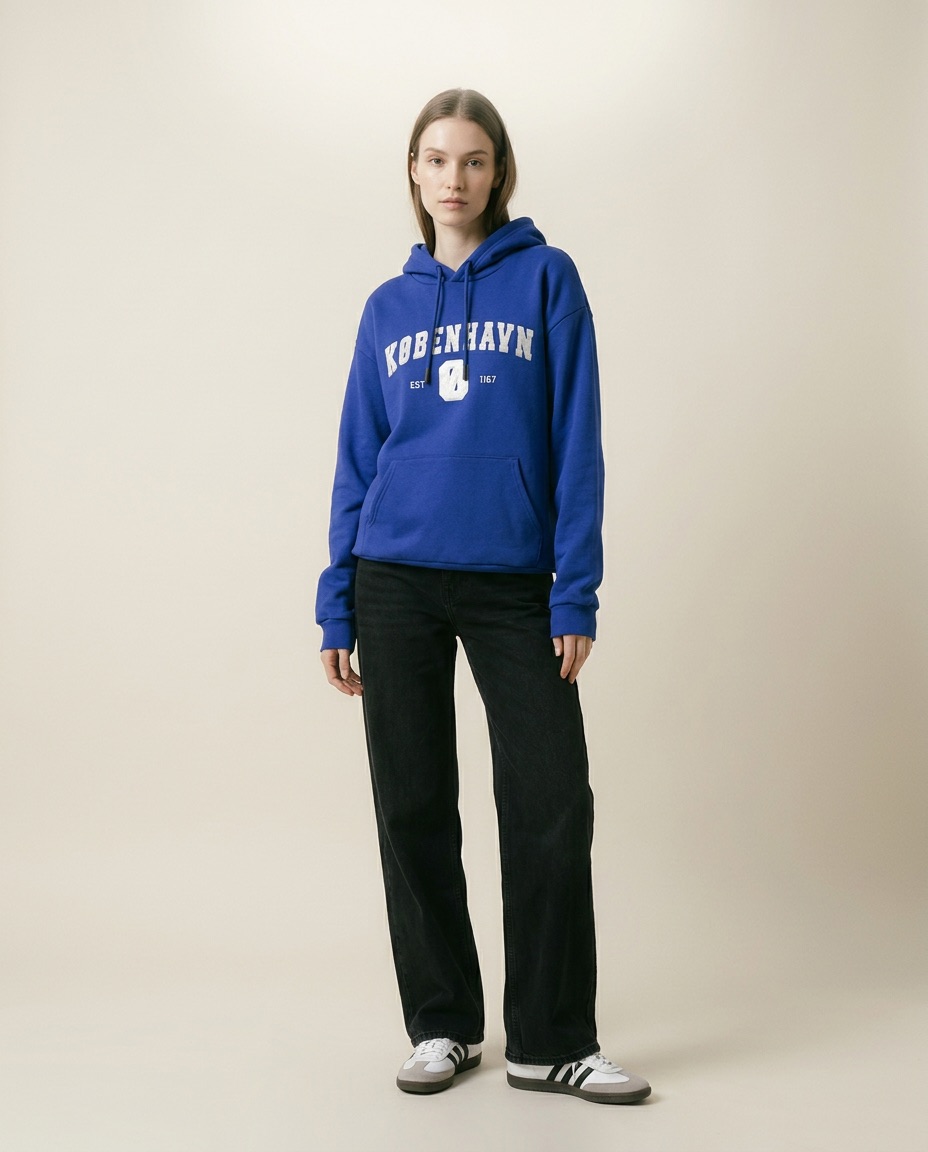 Farven på denne hoodie er inspireret af de gamle blå emalje-vejskilte du kender fra vores gader og stræder. Man har anvendt emalje siden oldtiden, men teknikken blev særligt populær omkring renæssancen og derefter, også her i Danmark. Et eksempel herpå, er Christian IV’s krone, hvorpå teknikken blev anvendt i kombination med ædle metaller og sten. Den blå farve var dog den eneste man havde tilgængelig til emaljeproduktion udover sort og hvid, som man normalt brugte til skilte, så det var mere af praktiske årsager end et bevidst stilvalg, at det blev den blå farve vi nu ser på vores smukke vejskilte.